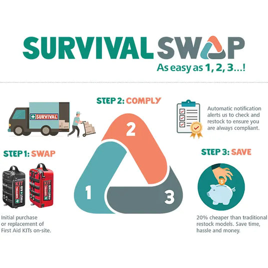 The SURVIVAL SWAP offers an initial purchase for below RRP of quality first aid kits from an Australian family business that has been innovating first aid solutions for more than 30 years. However, if you already have SURVIVAL first aid kits onsite, we can work with this too.