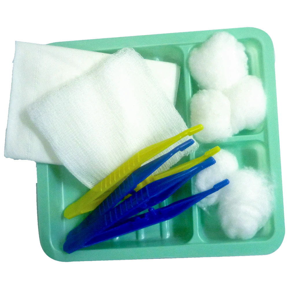 Basic Wound Dressing Pack contains a dressing tray, gauze, cotton balls, disposable plastic forceps and a dressing towel