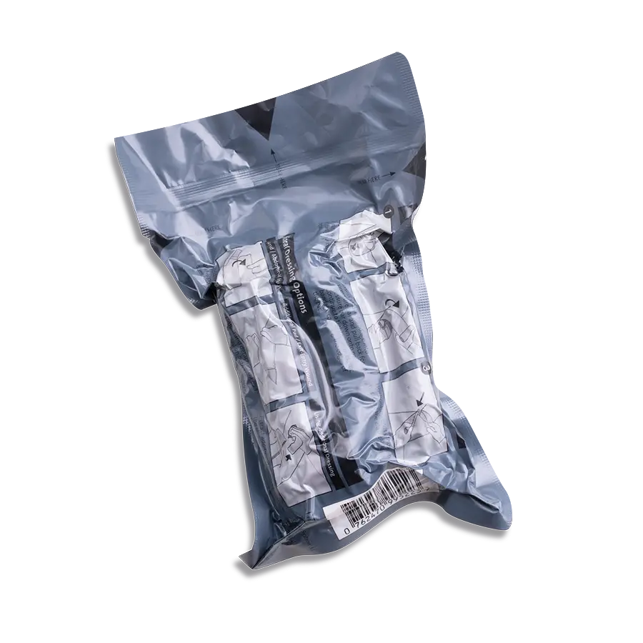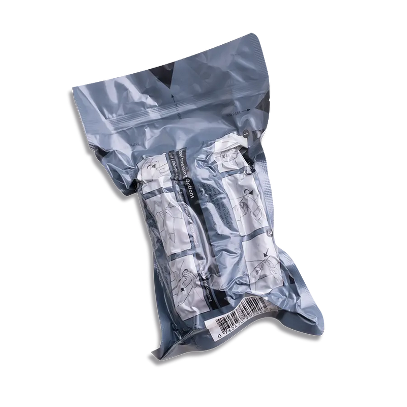 The Tactical Trauma Treatment Bandage (T3) provides a multifunctional solution to a wide range of injuries in a compact package. While facilitating the treatment of conventional wounds, abdominal and large wounds, amputations, entrance/exit wounds and more, the bandage allows cleaning, packing, coverage and compression of single and multiple wounds. The bandage is easily applied by untrained personnel and features a fully expandable and detachable large sterile dressing pad, and elasticized cloth leader, an easy to use closure bar and an extractable gauze for cleaning/packaging and secondary wound dressing.